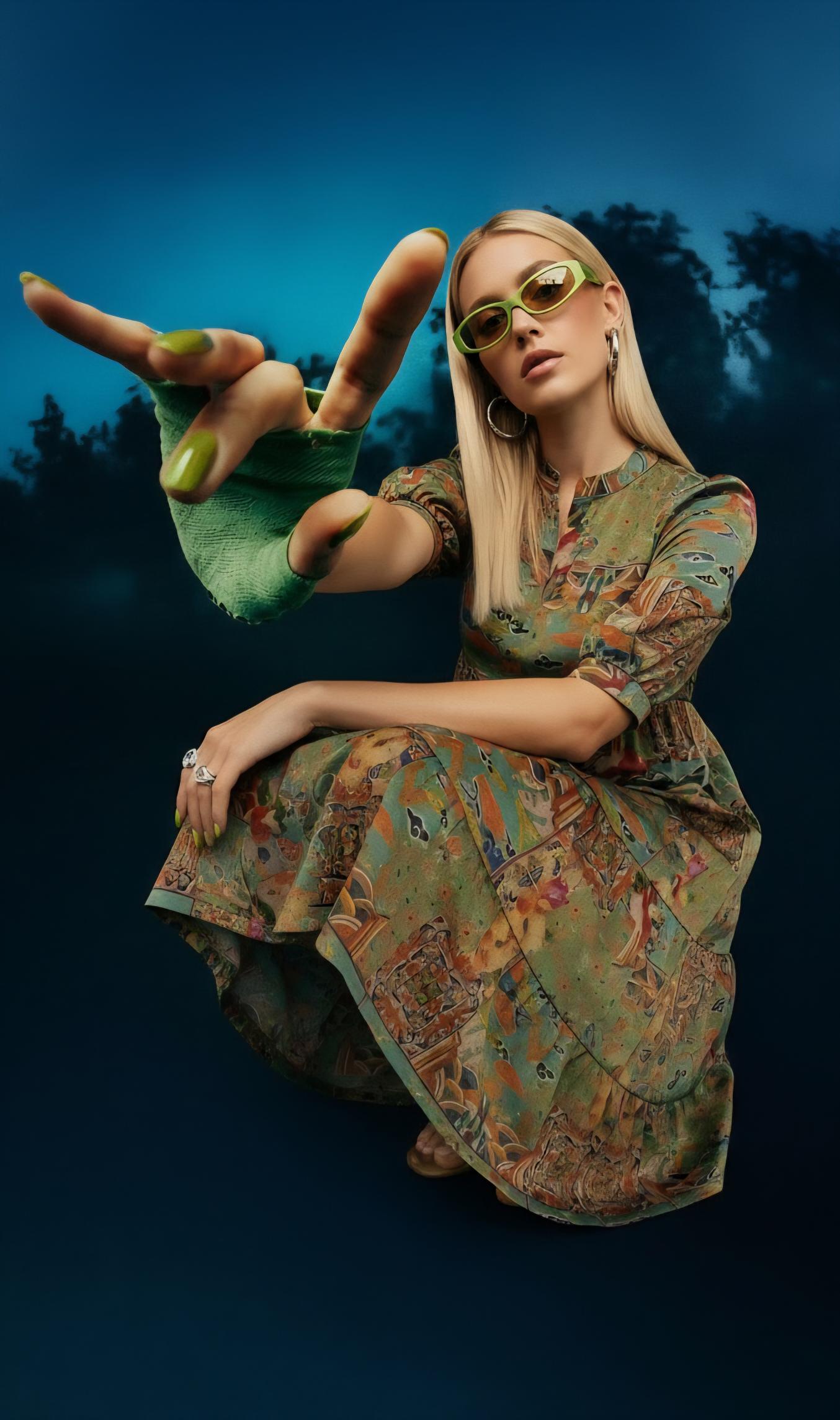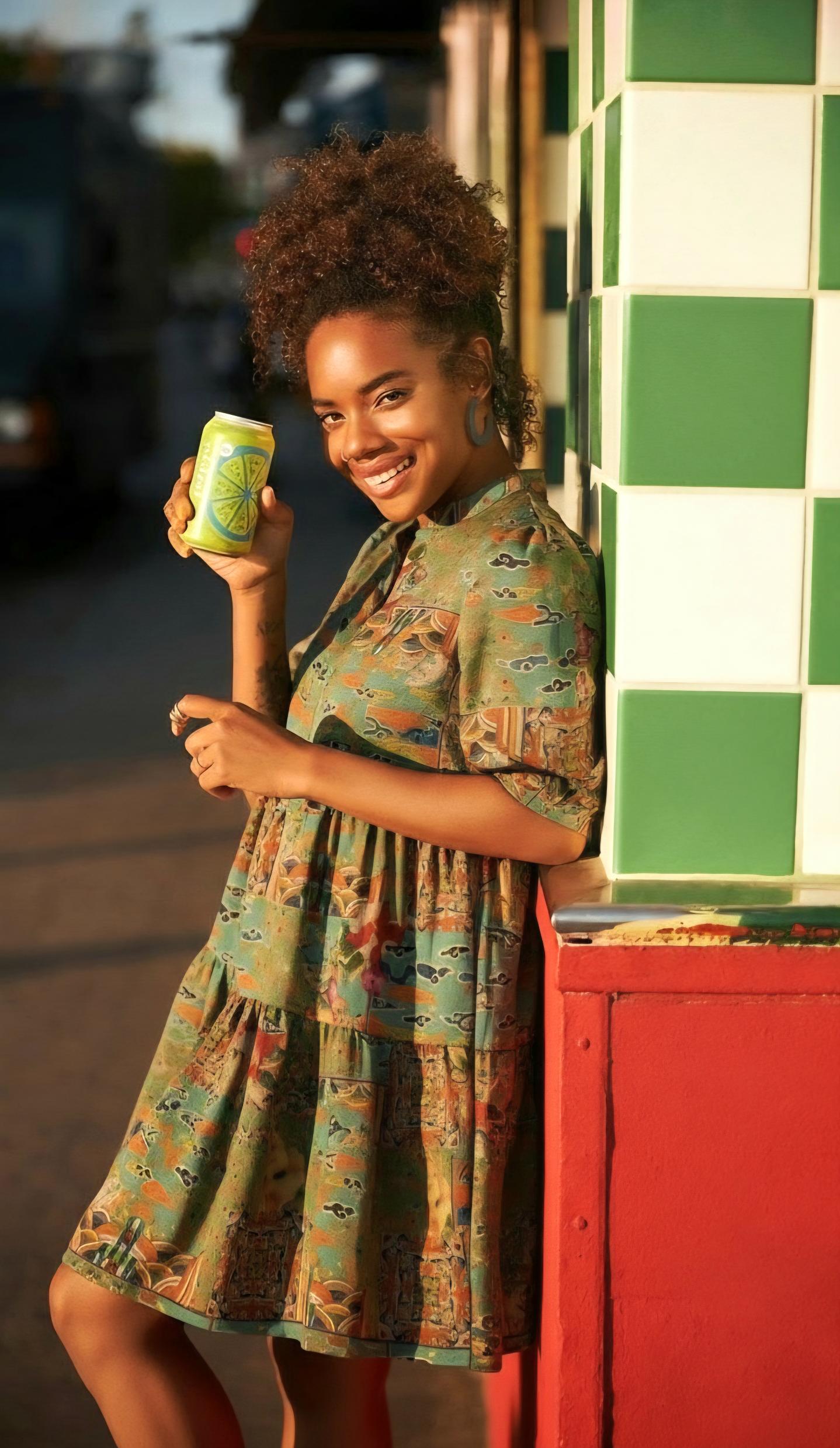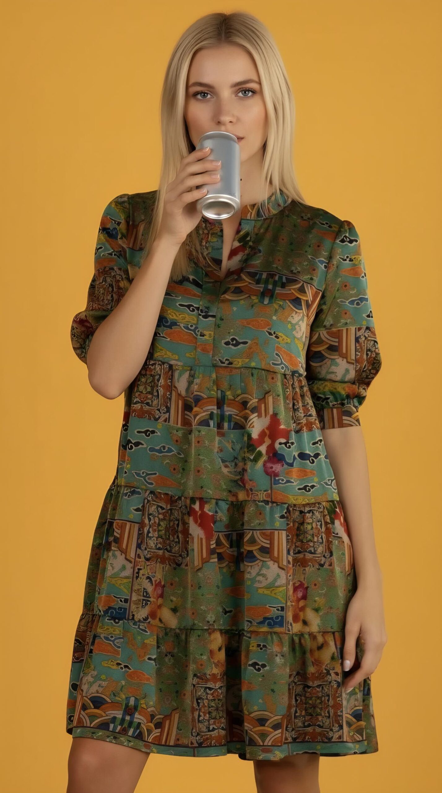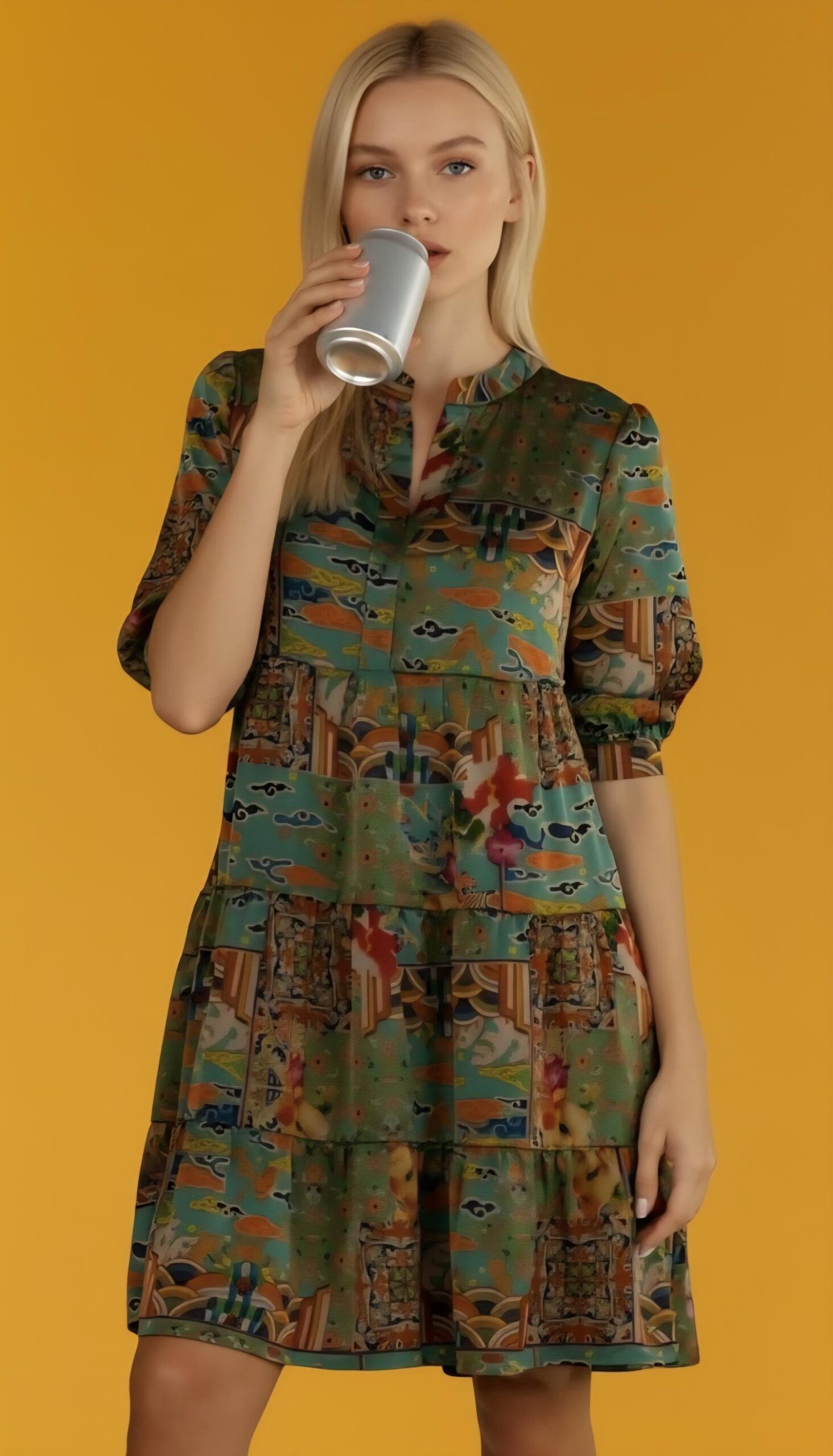 Vestido corto, cuello mao, abotonadura delantera y manga francesa.