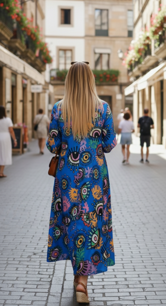 Estampación de ojos multicolorsobre fondo azulón.