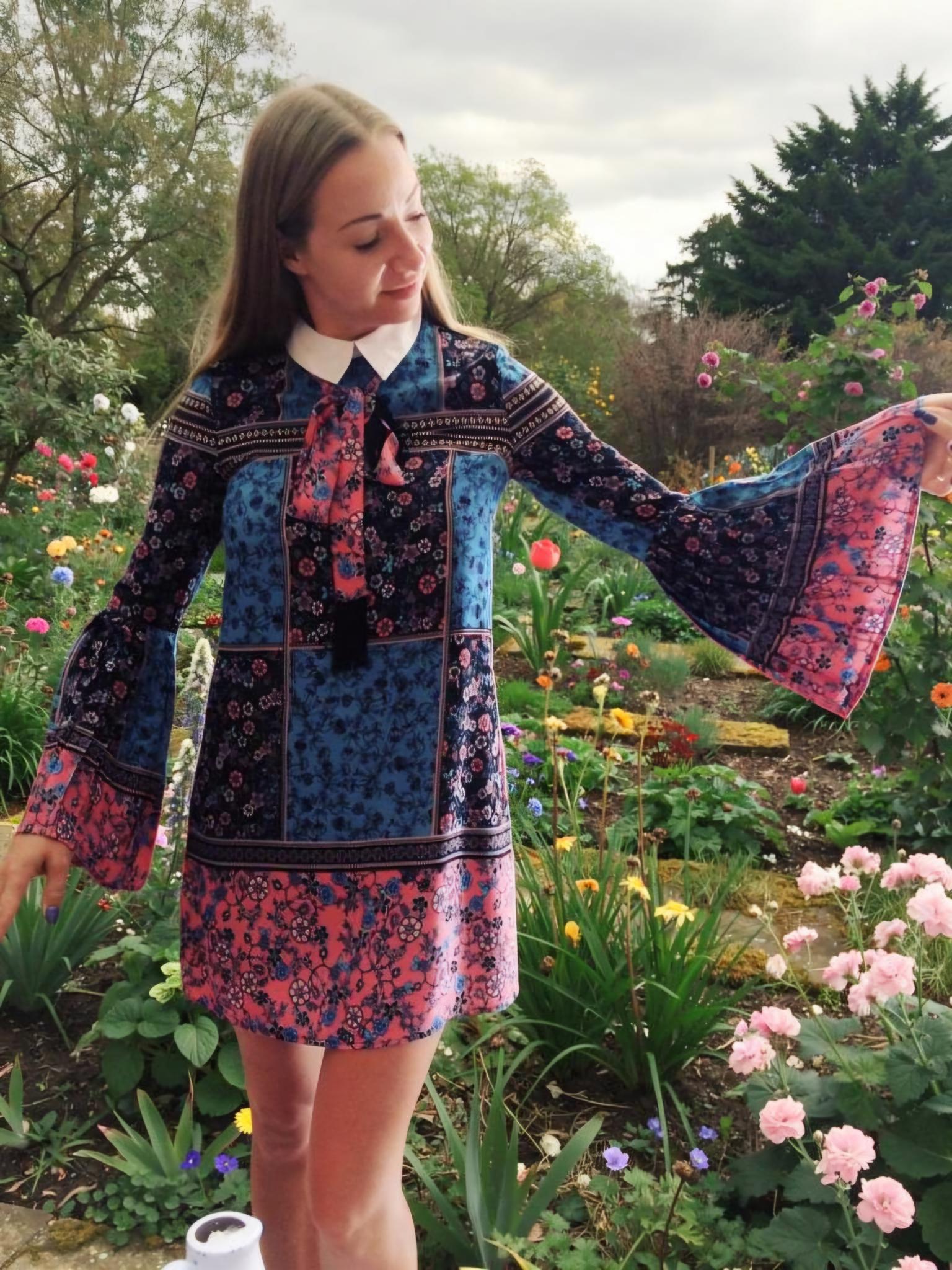 Lazo corbatín al tono con el vestido y flecos decorativos.