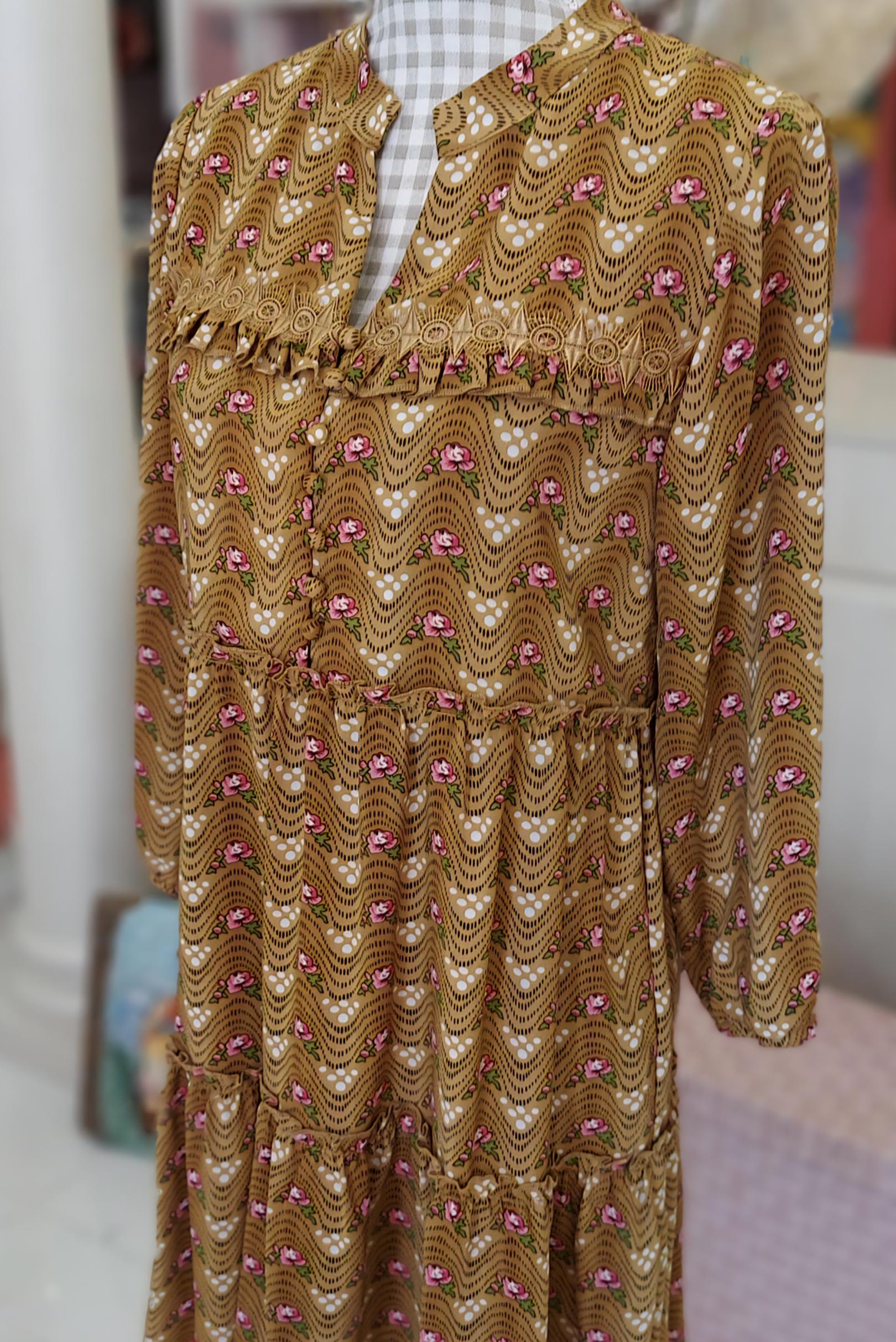 Vestido en tejido fluido con estampación floral discreta sobre fondo color miel.