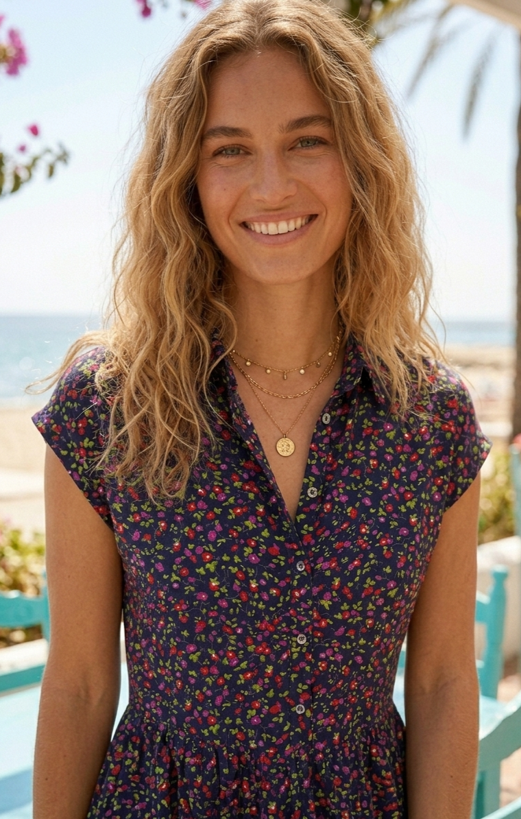 Vestido corto abotonado hasta la cintura.