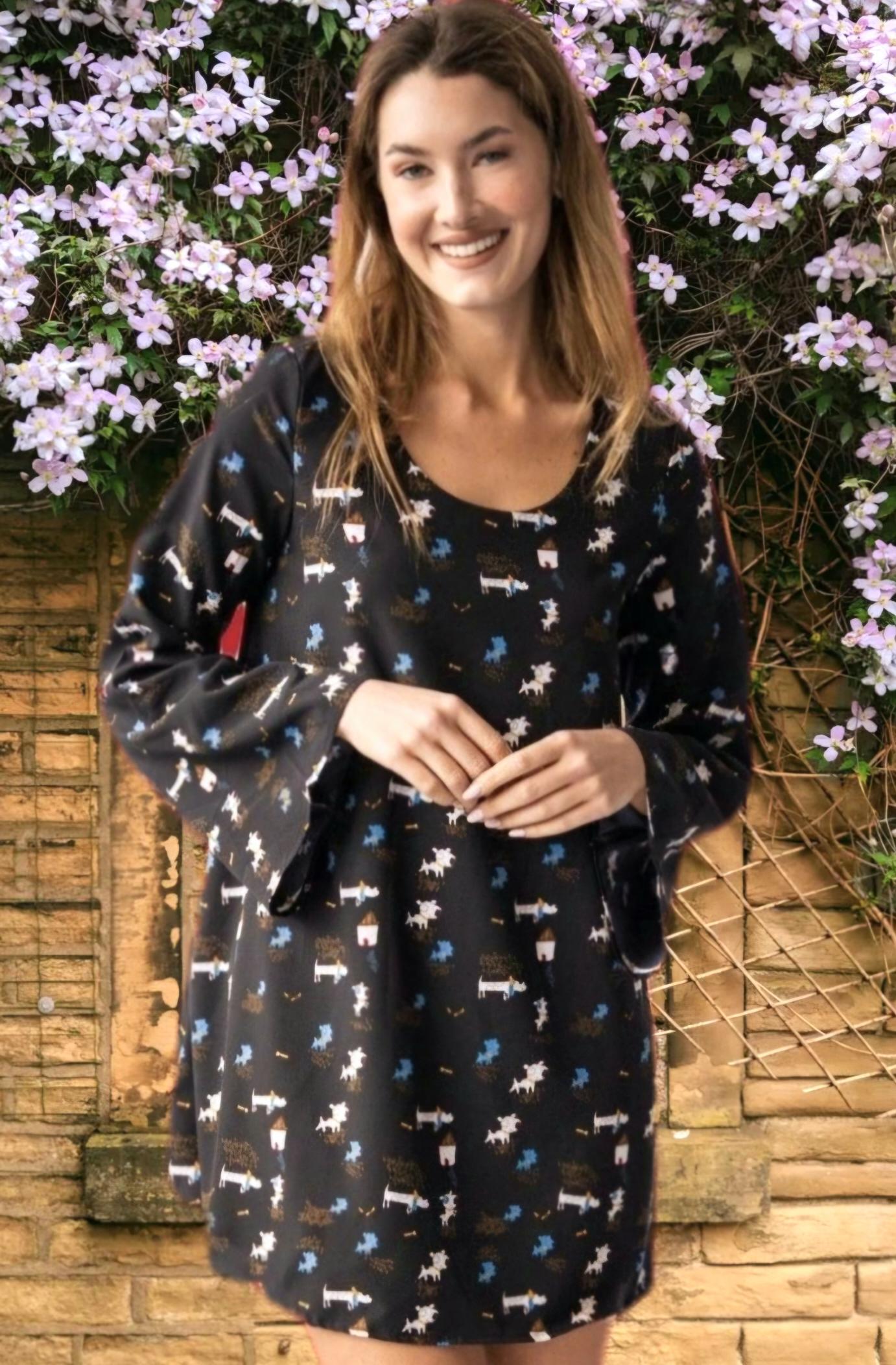 Estampación de perritos azules y blancos sobre fondo negro.