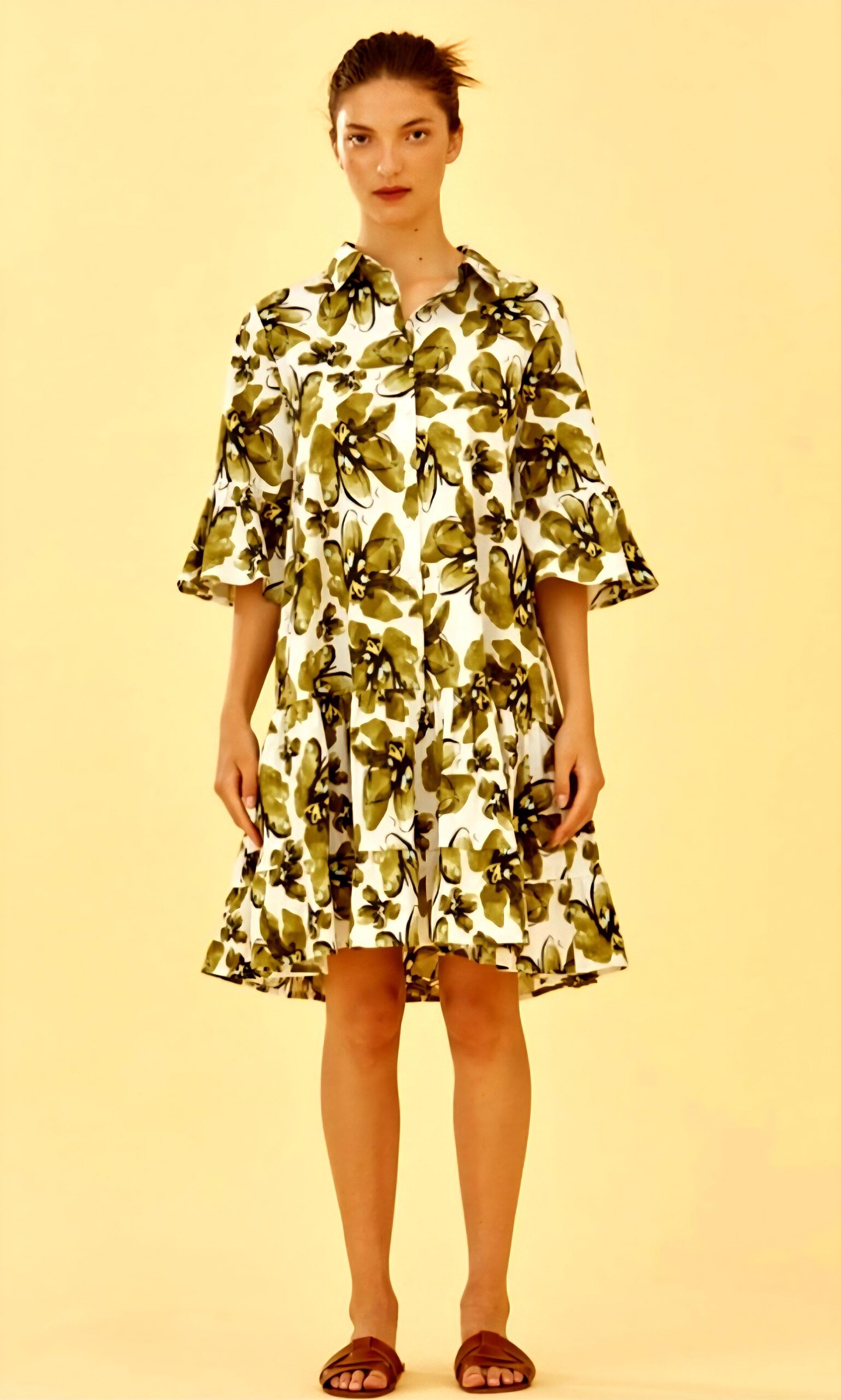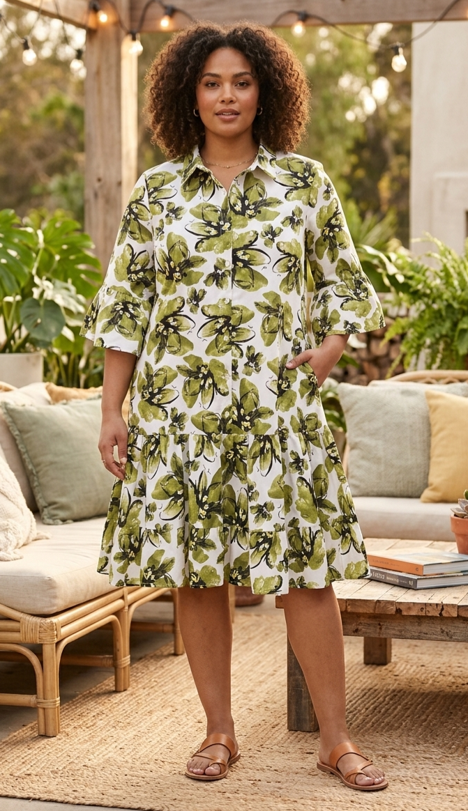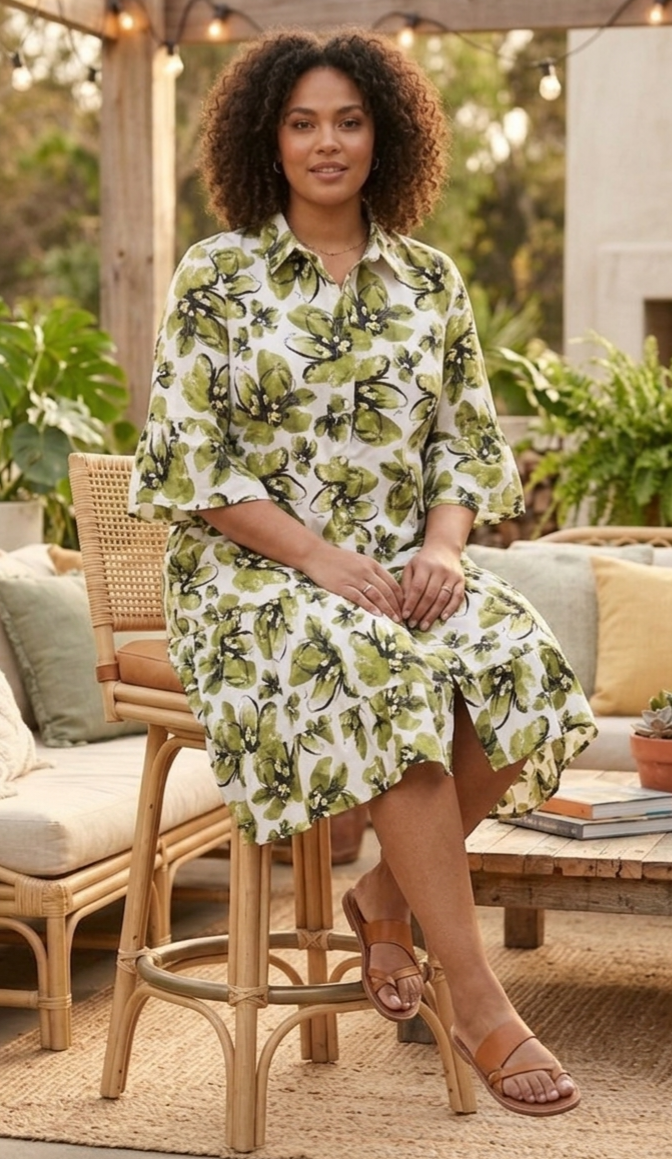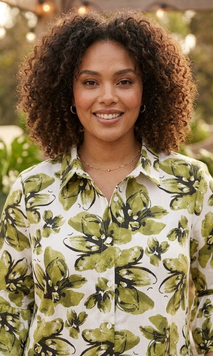 Estampación maxi floral en color verde oliva sobre fondo blanco.