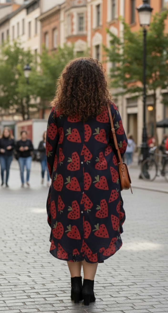 Vestido largo midi con estampado fresas.