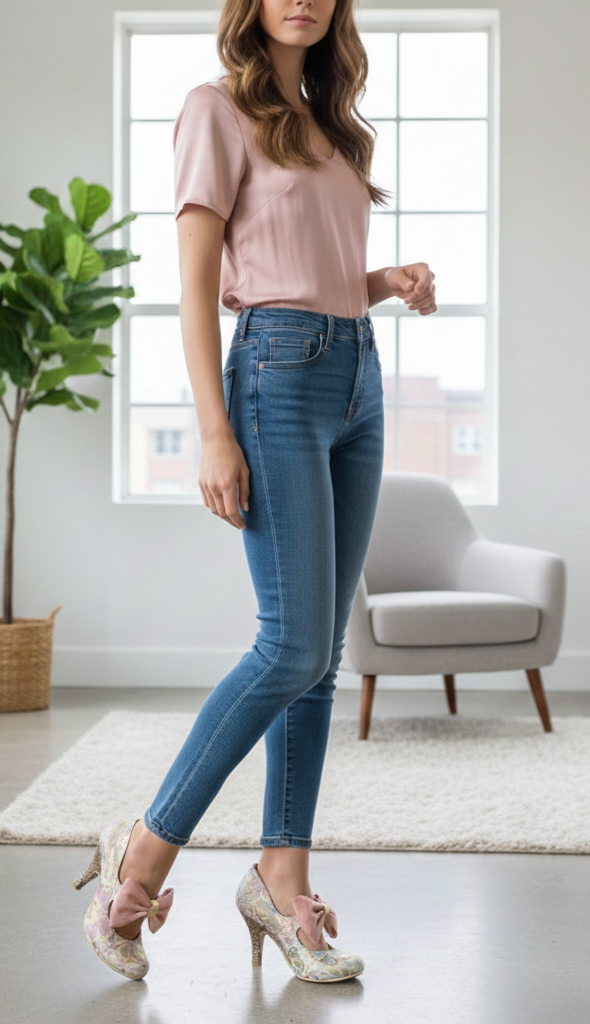 Zapato jacquar de tacón rosa.