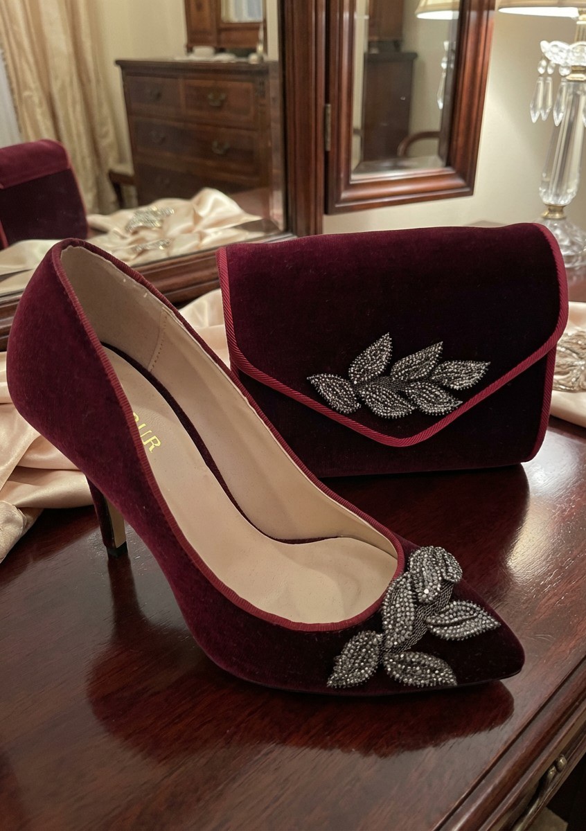 Zapato salón de terciopelo burdeos.